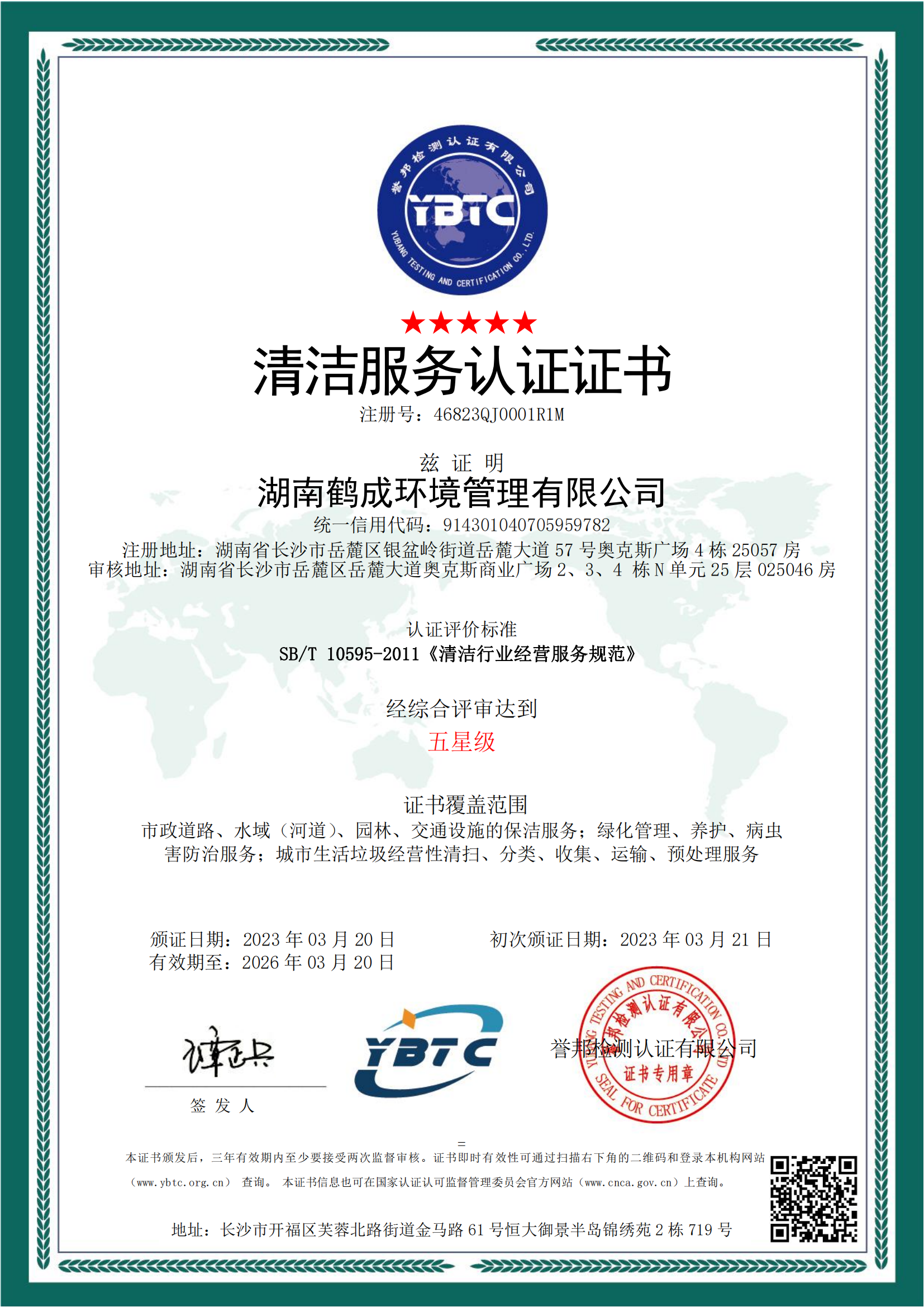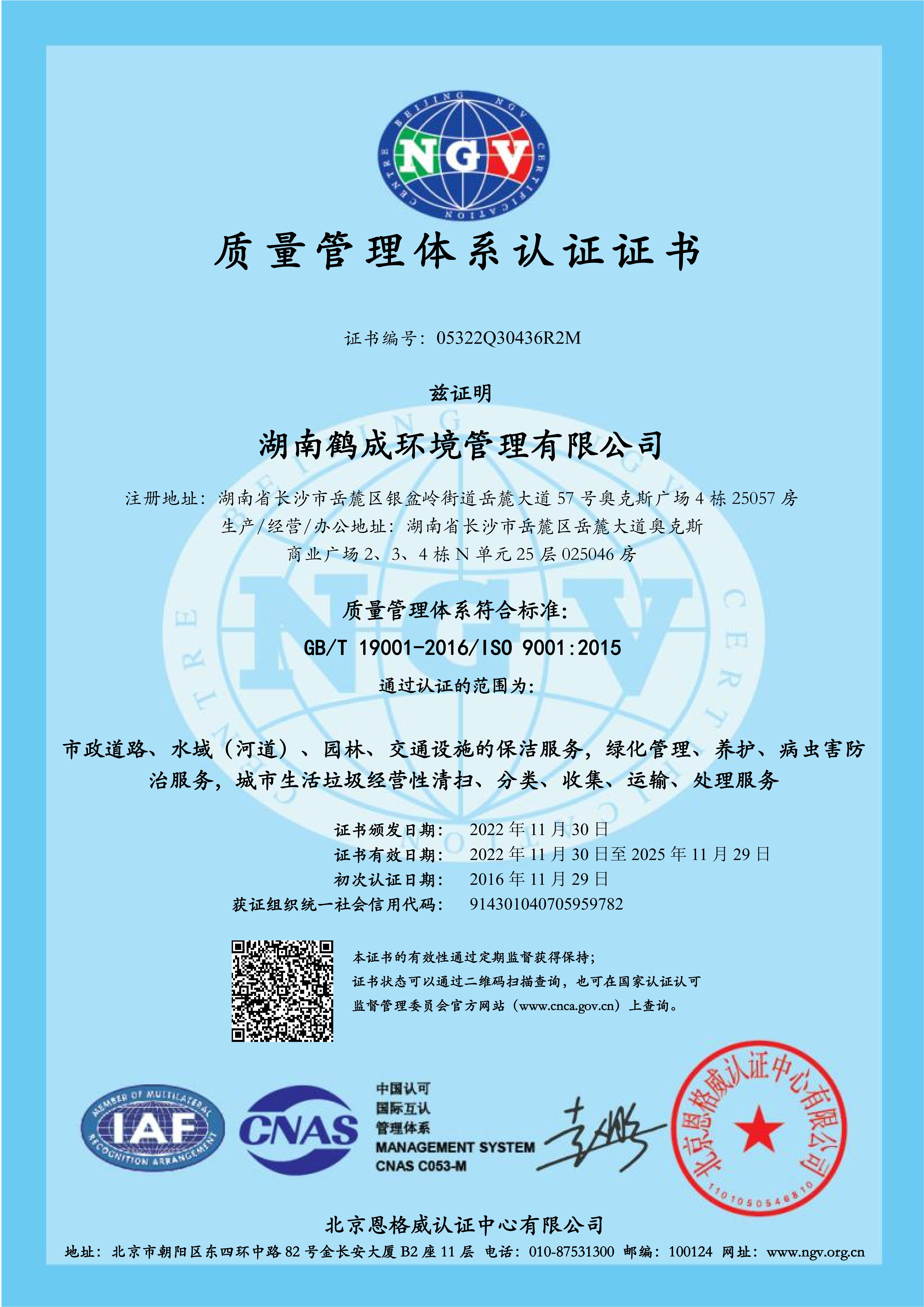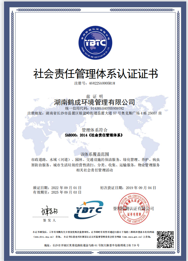 目前公司总部自有办公面积500多平方米,座落在湖南省长沙市岳麓区奥克斯广场,公司配备行业优质的清洁机械设备,现有多功能机扫车、大型洗扫车、自卸式垃圾清运车、高压清洗车、高压水车、垃圾(平板)车、压缩垃圾车、高温高压洗地机、新能源车、巡查车等多种类环卫车辆。为方便管理公司环卫车辆、优化出行路线、高效指导环卫工作,公司搭建了鹤成环境智慧环卫管理云平台,对我司车辆进行数字化、专业化、精细化管理。公司主要经营市政道路清洁维护、物业清洁维护、园林绿化工程服务、风景园林工程设计与施工、交通设施的清洗维护、城市生活垃圾 收集运输、绿化管理等服务项目。